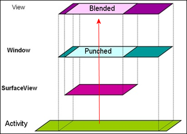 SurfaceView는 아래의 그림과 같이 Window의 아래쪽에 위치, Window를 뚫어서(punched) 자신이 보여지게끔 한다. 만일 해당 Window위에 다른 View가 있는 경우는 블렌딩(Blended)이 되어 보여지게 된다.