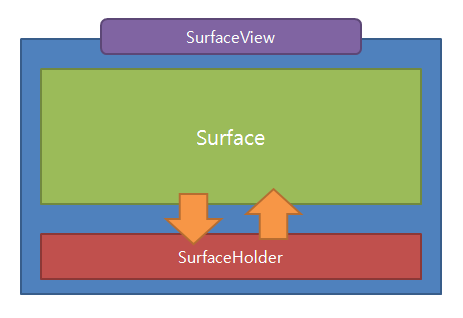SurfaceView 구조 SurfaceHolder와 surface가 계속 통신하면서 SurfaceHolder가 Surface에 접근하여 화면을 처리해주는 구조이다.