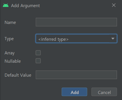 인수 이름, 인수 유형, 인수의 null 허용 여부 및 필요하다면 default값을 입력하여 정의한다.