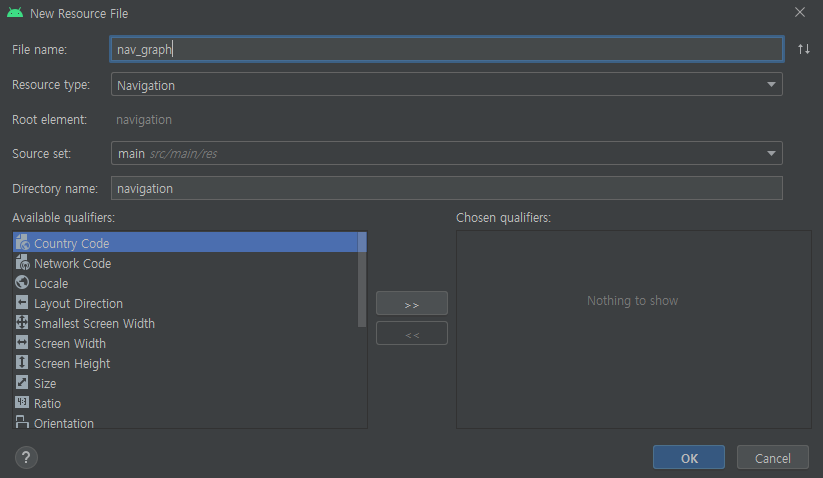 File name 필드에 resource file 이름을 입력, Resource type 드롭다운 목록에서 Navigation을 선택한다.