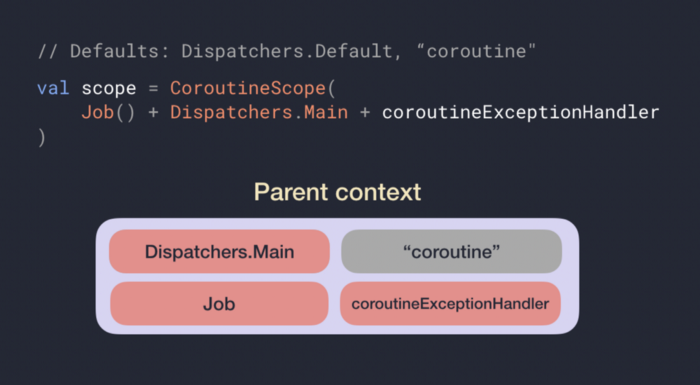 Parent context = Defaults + inherited CoroutineContext + arguments