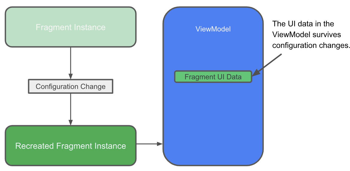 화면 회전과 같은 구성 변경이 발생하면 Fragment과 같은 UI 컨트롤러는 다시 생성된다. 그러나 ViewModel 인스턴스는 유지된다.