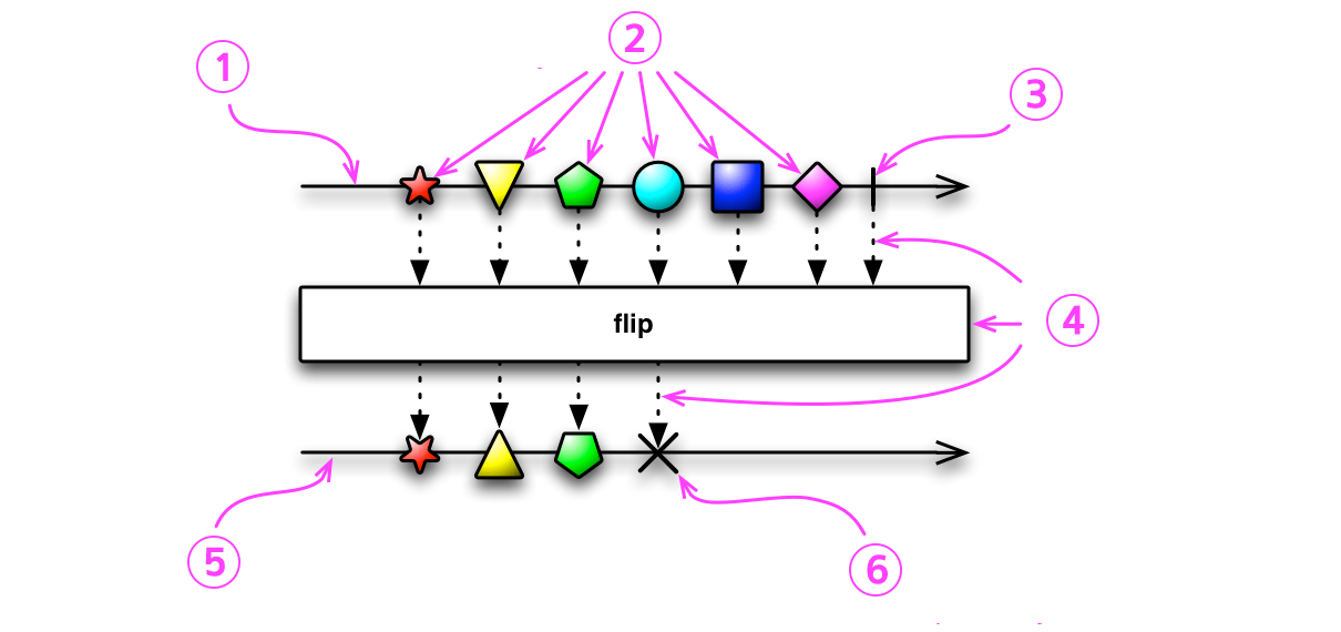 6. Observable가 비정상적으로 종료되거나 에러 발생시, 수직선이 아닌 X가 표시된다.